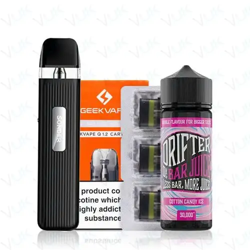 We have bundled these items to provide a cost-saving 18% discount compared to buying each item individually. Better still, ongoing replacements for Drifter Bar 50/50 shortfill e-liquids and Geekvape Q replacement pods will continue to offer a cost-saving means of quitting smoking.